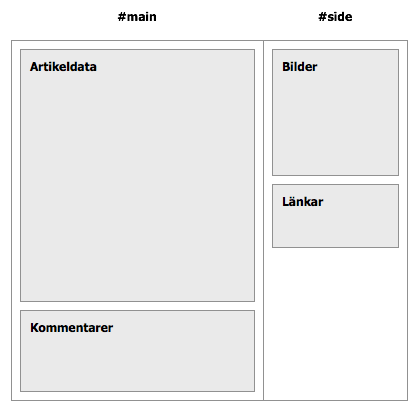 Ok, hur fungerar det just nu då? Jo, när jag sätter upp en Atlas-site så bestämmer jag hur stor #main och #side är i pixlar. Det bestämmer hur stora bilder ska vara och resultatet är alltså två kolumner. Sedan kan man avgöra vilka artikelmoduler som ska vara med, det kan mina kunder själva ställa in och man kan ha en global inställning, sen en inställning per artikelkategori och slutligen kan man ha en egen inställning på en specifik artikel. Artikelmoduler är saker som bilder (i sidospalten), kommentarer, info om skribenten osv. Allt som inte är själva artikeltexten. Och regeln har varit att kunden kan bestämma ordningen på dem i sidospalten men det är allt. Inte positionen (bara kommentarerna är under artikeln tex) eller specifika inställningar. Bildmodulen visar till exempel alltid max sex bilder i ett 2x3-fördelning. Kolla på den lilla skissen till höger så känner ni nog igen hur Atlas fungerar.