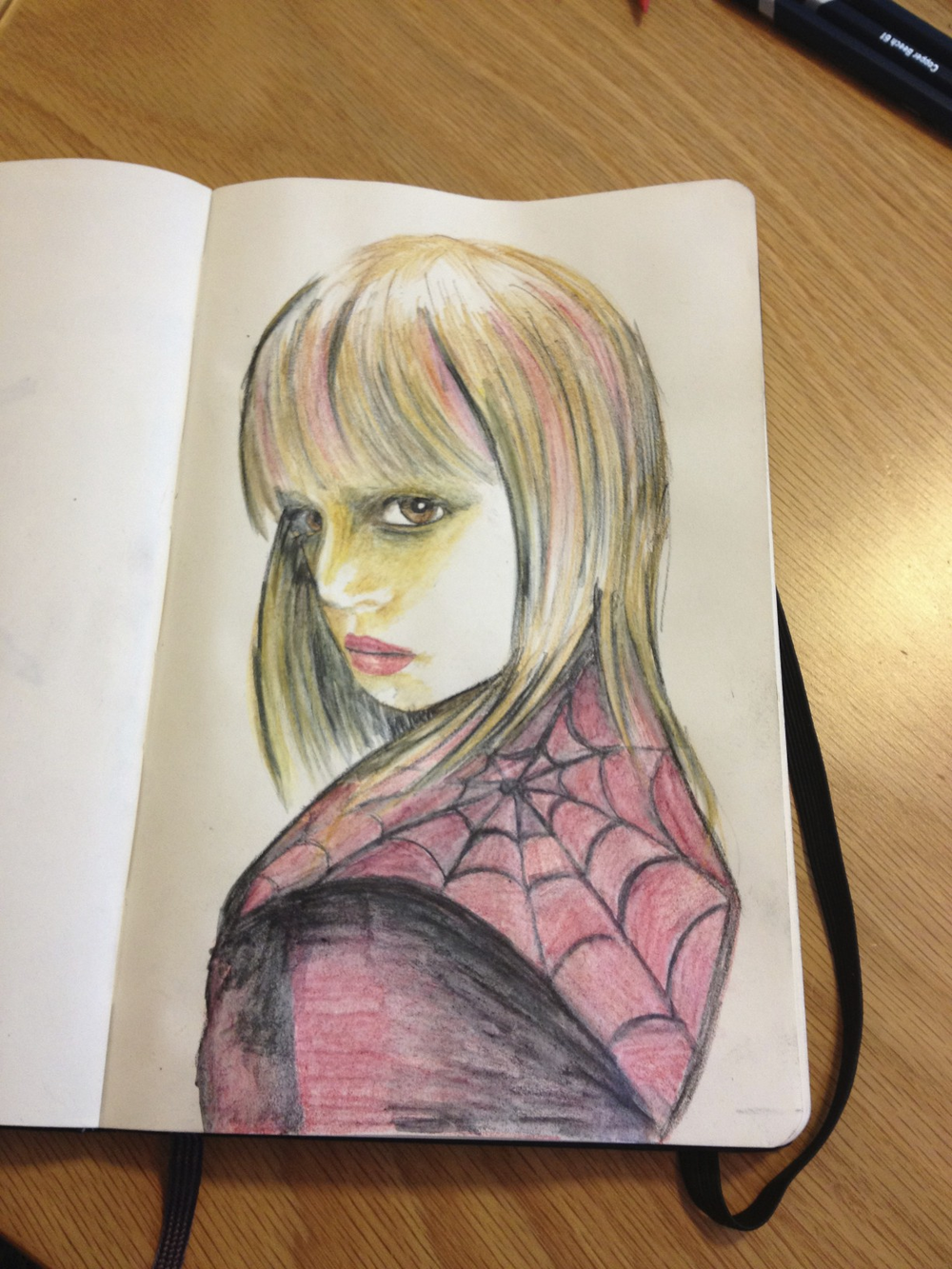 Jag var korkad nog att gå på efteråt med vatten så det sabbade bilden lite tyvärr... Ska försöka låta bli med det i fortsättningen. Men det är mest för att få fram mer lyster i färgerna, tycker inte de färgpennor jag har på jobbet ger tillräckligt mycket färg, plus att jag ritar i en normal Moleskine, som inte har speciellt ritvänligt papper, så att gå på med färger är svårt.