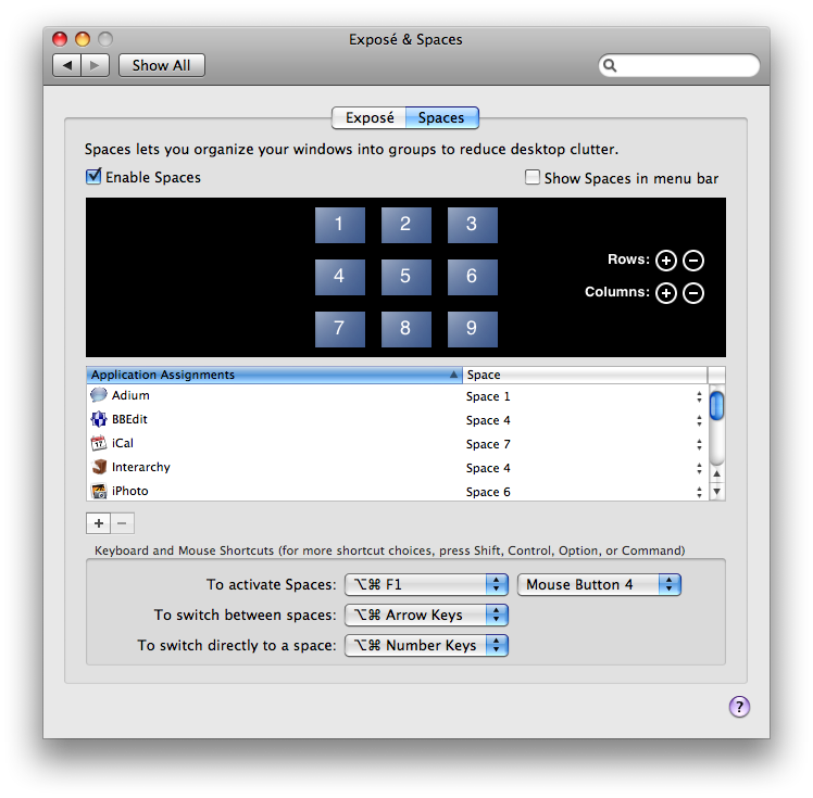 Något som är riktigt bra är att Spaces fungerar väldigt bra tillsammans med Exposé. Så om jag är på Space 1 och ska dra en fil till ett program på space 5 så tar jag tag i filen, kör igång Spaces, väljer Space 5, sen använder jag Exposé för att visa alla fönster på den space och sen väljer jag den applikationen. Riktigt smidigt.