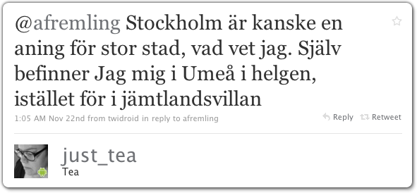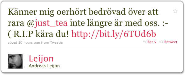 Jag vet inte vem "just_tea" är, men länken går till en nyhet på Aftonbladet om en bil som sladdade och krockade med en buss. Det var tre personer i bilen, och modern och dottern avled i bilen medan den sjuåriga sonen överlevde och hans tillstånd ska vara stabilt men ändå allvarligt skadad. När jag läste detta så blev jag så oerhört tagen av det. Går man in på just_tea's sida på twitter så kan man läsa detta: