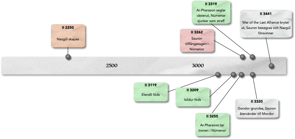 Det är också i den här perioden som Elendil och Isildur föds, och överlever Nümenors fall och grundar sedermera Gondor. Sauron har då återvänt till Mordor och drygt hundra år senare bryter War of the Last Alliance ut (öppningsscenerna från Lord of the Rings-filmerna) där Elendil dör, Sauron besegras och Isildur inte förstör ringen.