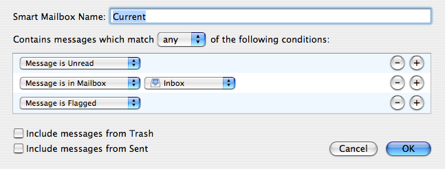Utöver saker som automatiskt filtreras bort så har jag framför allt en "Smart folder" i Mail som är oumbärlig. Den heter "Current" och är satt att visa alla mail som är antingen Olästa, Flaggade eller ligger i inlådan.