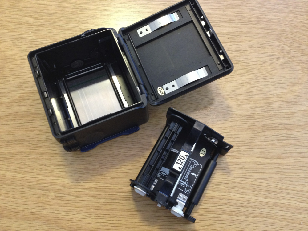 Filmen laddas inte riktigt som en normal 35mm-kamera heller. Detta är mitt 120-films bakstycke, och i den finns en kassett som man rullar upp filmen på och sedan sätter in i bakstycket och förseglar hela apparaten. Smidigt, men det är något jag måste gå igenom steg för steg när det är dags