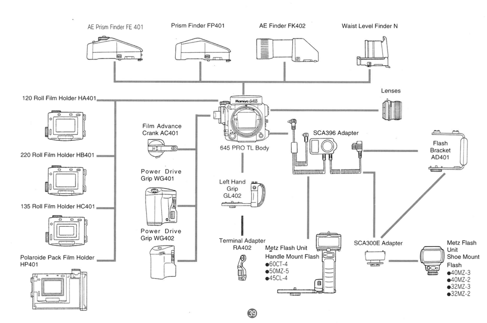 Så här ser kameran ut som jag köpte. Som ni ser så är den bra mycket större än en normal systemkamera. Det beror på att som många mellanformatskameror så är den helt moduluppbyggd. Förutom att byta optik kan man även byta bakstycke (för att fota med 120 eller 220, eller ett bakstycke för normal 35mm-film, eller ett bakstycke för polaroidfilm). Sedan kan man sätta på olika sökare (på toppen). tre olika horisontella (då håller man kameran uppe vid ansiktet och ser genom en sökare precis som en vanlig systemkamera) och en vertikal där man håller kameran i midjehöjd och ser ned i sökaren.