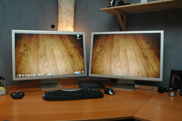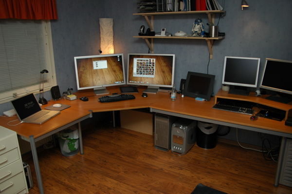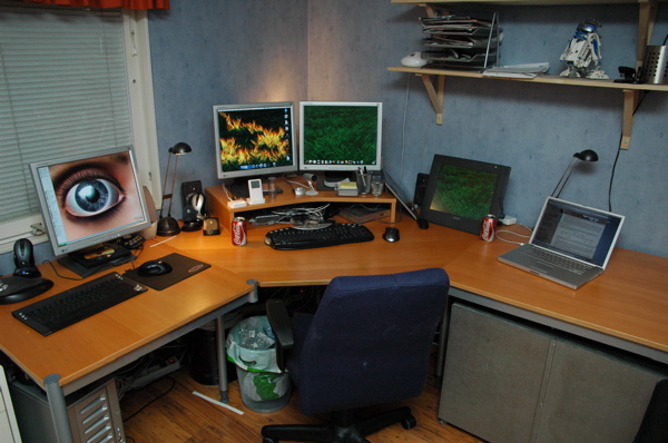This is my old setup, with a 3.2Ghz PC (the 'eye' screen), a dual 1,25Ghz Mac G4 with two 18" monitors and a 17" Wacom Cintiq. Also a 15" 1,25Ghz PowerBook.