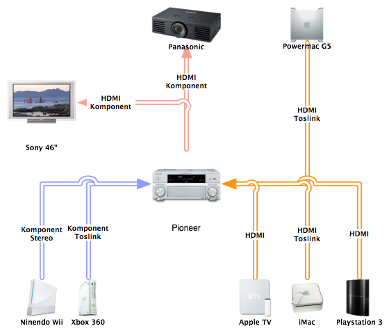 Förstärkaren är ju en Pioneer VSX-AX4ASi-S, som jag valde eftersom den stöder 1080p. Skitbra. Förutom att den är himla bökig att ställa in, gränssnittet för menyer och sådant är riktigt 80-tal och det hela känns väldigt primitivt, så funkar inte allt som jag vill. Till exempel så förlorar min Media-Mac kopplingen till den när den inte är vald, så när man väljer den igen så hoppar den inte igång och tror inte den har en monitor inkopplad. Jag kör DVI->HDMI kabel för den.