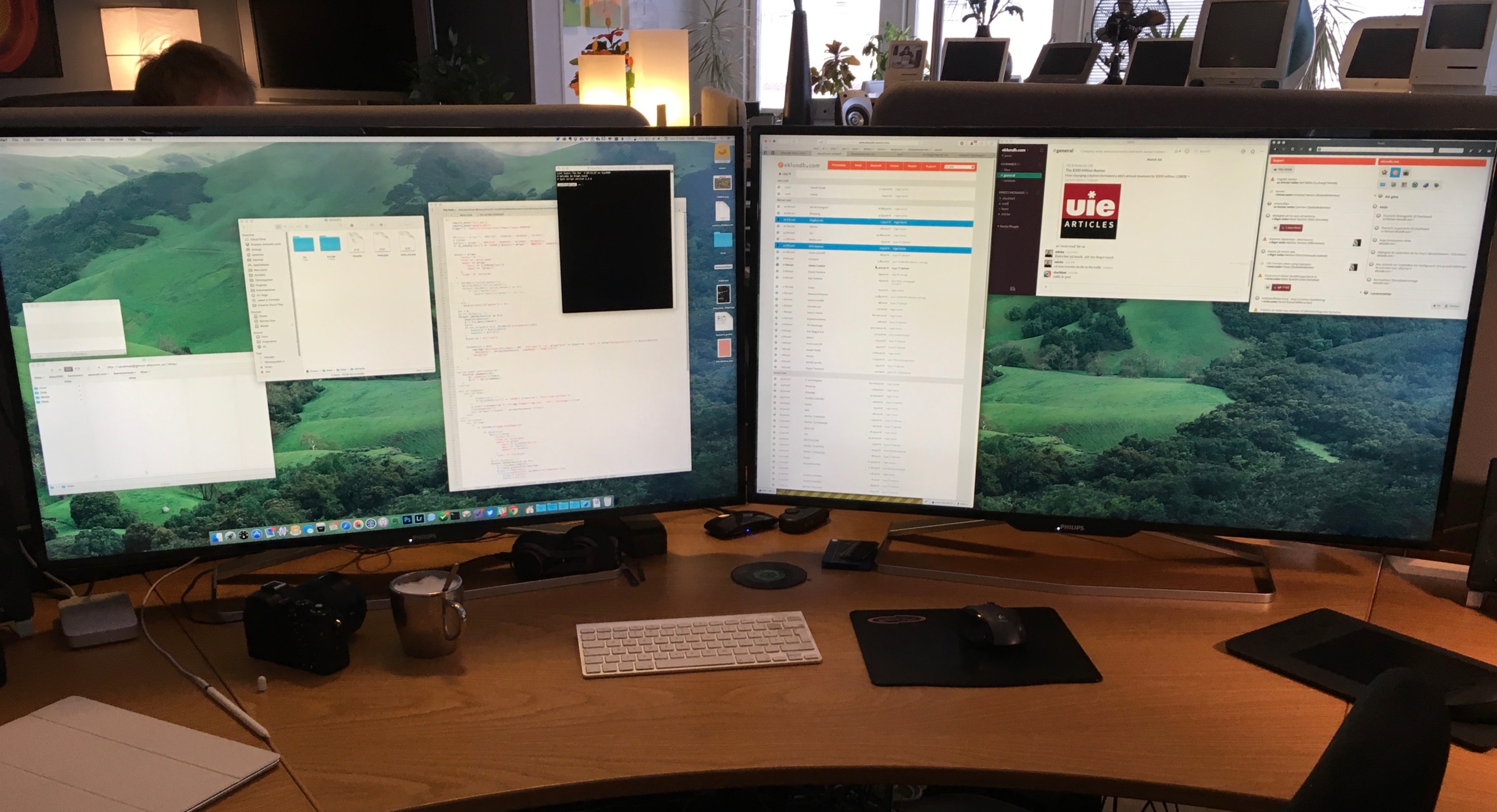 Kröp till korset och köpte två stycken 40-tum (!!) 4K-skärmar till jobbet. Varje är på 3840x2160, uppdaterat från mina gamla 30-tum 2560x1600-skärmar.