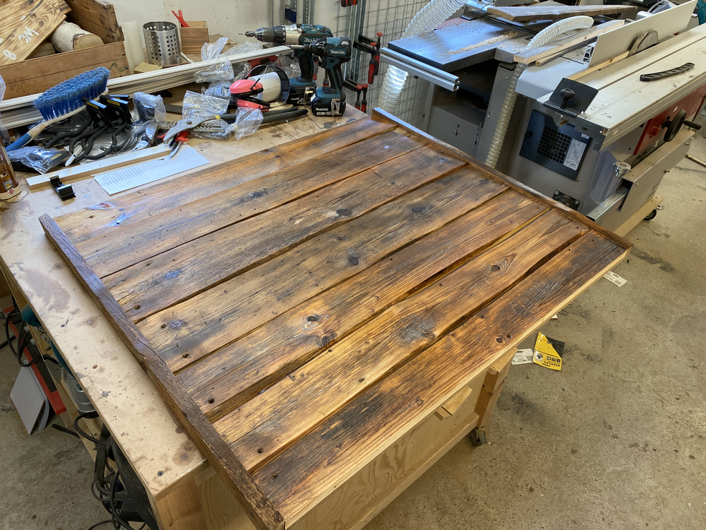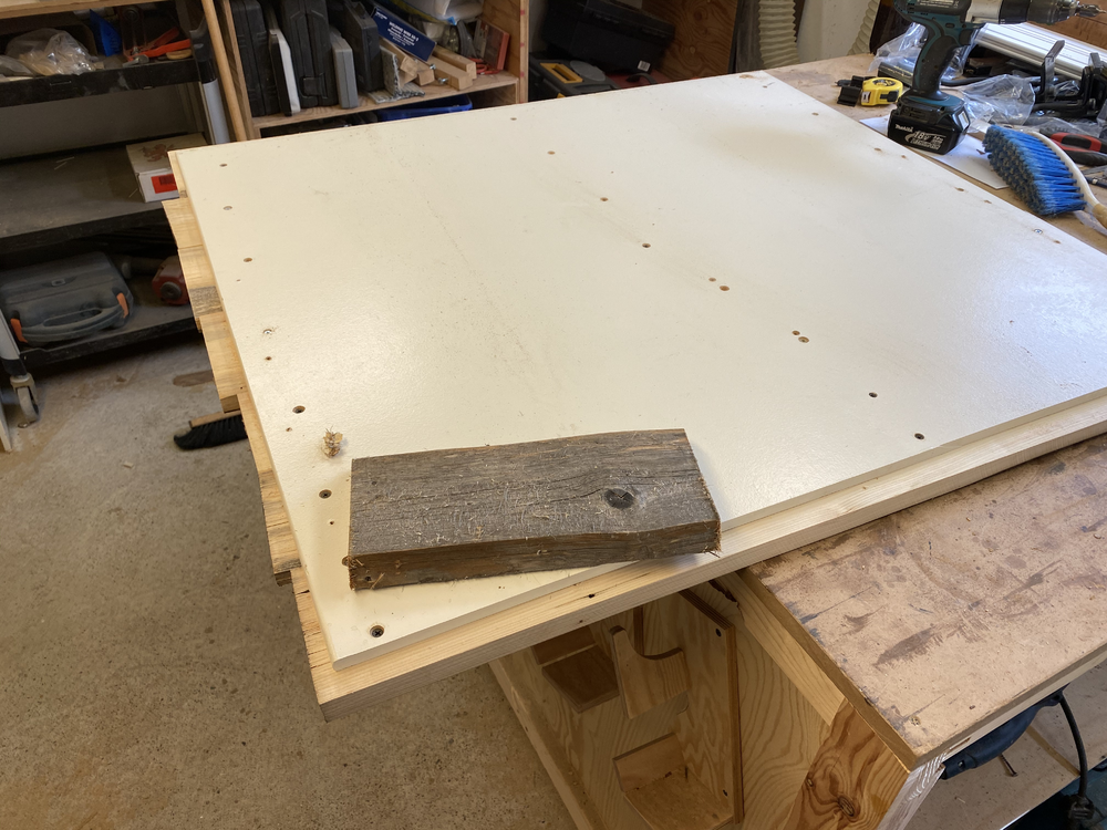 Jag skruvade loss skivan som satt där och använde de måtten för att kapa till gammalt virke som jag sedan planhyvlade på ena sidan så jag kunde skruva fast dem mot den skivan.