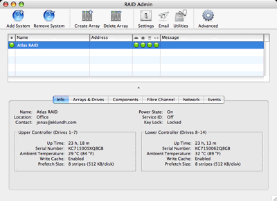 Det hände mig för övrigt idag, med den gamla gamla Atlas-servern som var en Linux-server med Raid-kort, som tycks ha dött. Då är det bra att ha verktyg som ovan för att se felen i tid. Jag har även ett spare-part kit till både Xserve och Raid:en som innehåller en extra disk, ett extra nätaggregat osv osv...