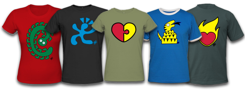 Tina har sagt förut att hon tycker man ska kunna köpa T-shirts med motiv från mina tavlor på. Jag har alltid tyckt det var en bra idé, men har inte gjort något åt det riktigt. Men nu har jag tagit mig tid att lägga upp en hög motiv på T-shirts och kaffemuggar och sådant. Om man vill ha en tröja med Huggsnok, Gurkmask, Giraffen, Glädjeviruset från MälarNetCity eller varför inte en tröja med GameConnect-loggan på?