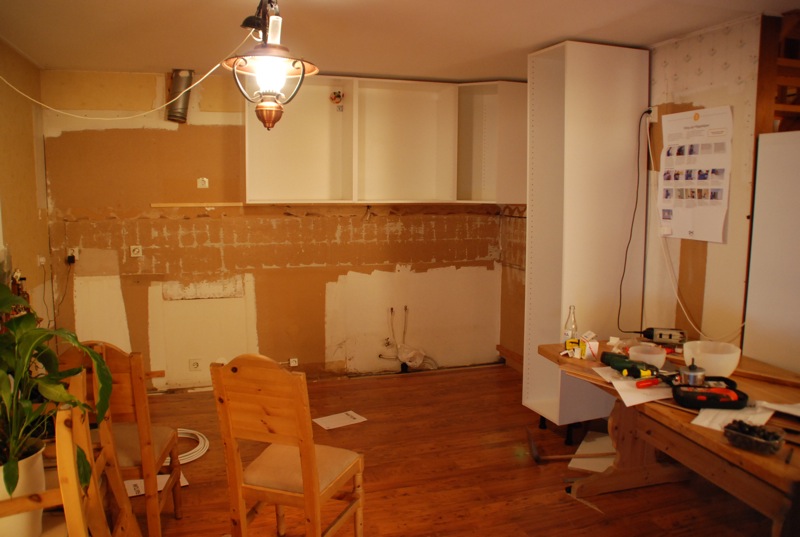 Vi har kommit lite längre med köket också, tre skåp är uppe och det har gått rätt så bra. I morgon ska vi på Guldstänk så det blir inget mer uppsatt förrän i helgen. Jag börjar fundera på om man ska be IKEA att sätta upp köket, eftersom det förmodligen går mycket snabbare. Men jag vet inte vad det skulle kosta... Nåja, detta funkar ju än så länge, så...