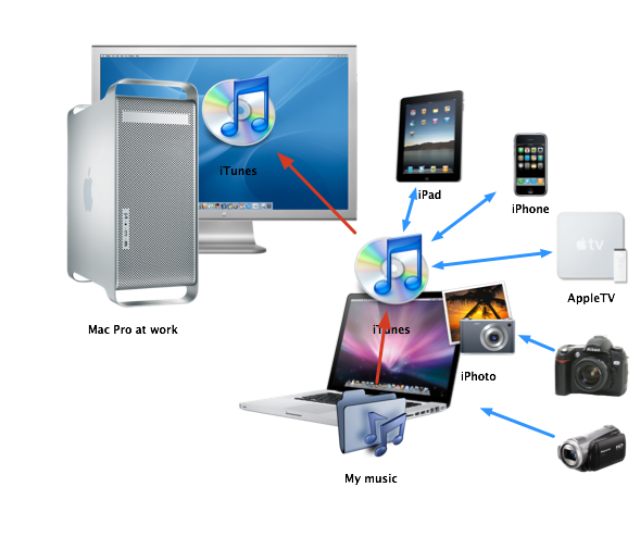 So, this is pretty much my setup now. I have all my music (about 60GB worth) and all my photos (over 20k photos) on my Macbook Pro and this is my Digital Hub. All the blue lines are devices that I sync or import from to my laptop. This is a great setup since I have all my media with me, and I can sit in the sofa at home and edit home moives (which I never do, but I can). The red line going from iTunes to my Mac Pro at work is the built in sharing function in iTunes that shows my laptop in iTunes on my Mac Pro and I can listen to music (but not edit playlists and such).