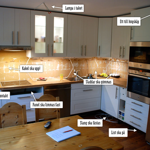 Ja, det känns i alla fall som det. Vi har äntligen haft en elektriker här, som dragit om el högt och lågt och fixat spis och belysning. Skönt! Men det krävde dock att jag fick skruva ned ett par av skåpen, inklusive högskåpet med ugn och mikro i. Så det känns som om man verkligen är tillbaka på ruta ett. Huset är återigen fyllt med husgeråd och prylar som tidigare stod i skåpen. Men nu har vi el, som tur är. Detta har gjorts: