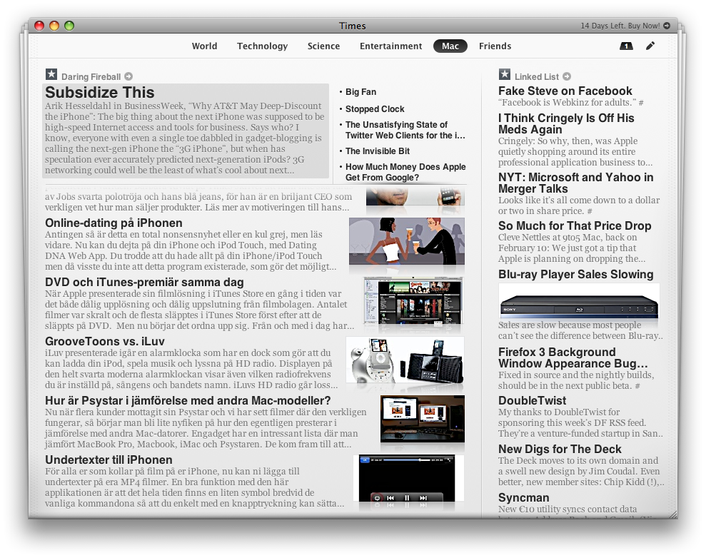 Men det har nyligen släppts en ny klient som heter Times, från Acrylic, som är ett nytt sätt att hantera nyhetsflöden. Jag har själv aldrig prenumererat på en morgontidning eftersom de nyheter som man kan läsa om där inte direkt intresserar mig. Däremot så läser jag ju branschnyheter, macnyheter och så vidare. NetNewsWire är ett trevligt sätt att samla ihop alla dessa individuella nyhetskällor till en trevlig lista, men Times går ett steg längre och i stället för att lägga alla nyheter i en lista så försöker den efterlikna utseendet hos just en morgontidning.