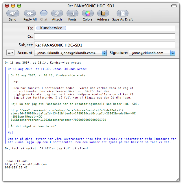 Det här är ett typiskt mail nu för tiden. Klicka på bilden så ser ni hur det ser ut. Helt otroligt stökigt. Jag måste scrolla ned till botten för att se vad det är han svarar på och sen scrolla upp igen för att fortsätta läsa. Detta är det lata sättet att svara på mail. Bara lägga till svaret ovan utan relation till vad man svarar på i mailet under. Noter att min fråga till honom finns allra längst ned i mailet och hans svar allra längst upp. Och i mitten så finns tidigare mail. Krävs en hel del detektivarbete för att lista ut vem som svarar på vad här. När jag svarar på ett sådnat här mail så städar jag alltid upp det så svaren kommer i rätt ordning, vilket är detta: