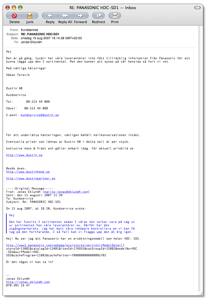 Hade hans mail sett ut som ovan så hade mitt svar sett ut så här. Jag hade enkelt bara klippt bort hans signatur och lagt till mitt svar. Enkelt, smidigt och med bra mycket mindre onödig text mellan innehållet i mailen.