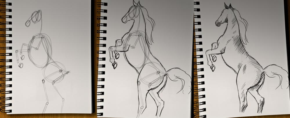 Jag har för övrigt övat mig på att rita hästar, och framförallt att förstå själva anatomin i dem. Lite overkill, men vad tusan. Här är ett exempel på en häst i tre stadier. Inte perfekt, men åt rätt håll i alla fall.