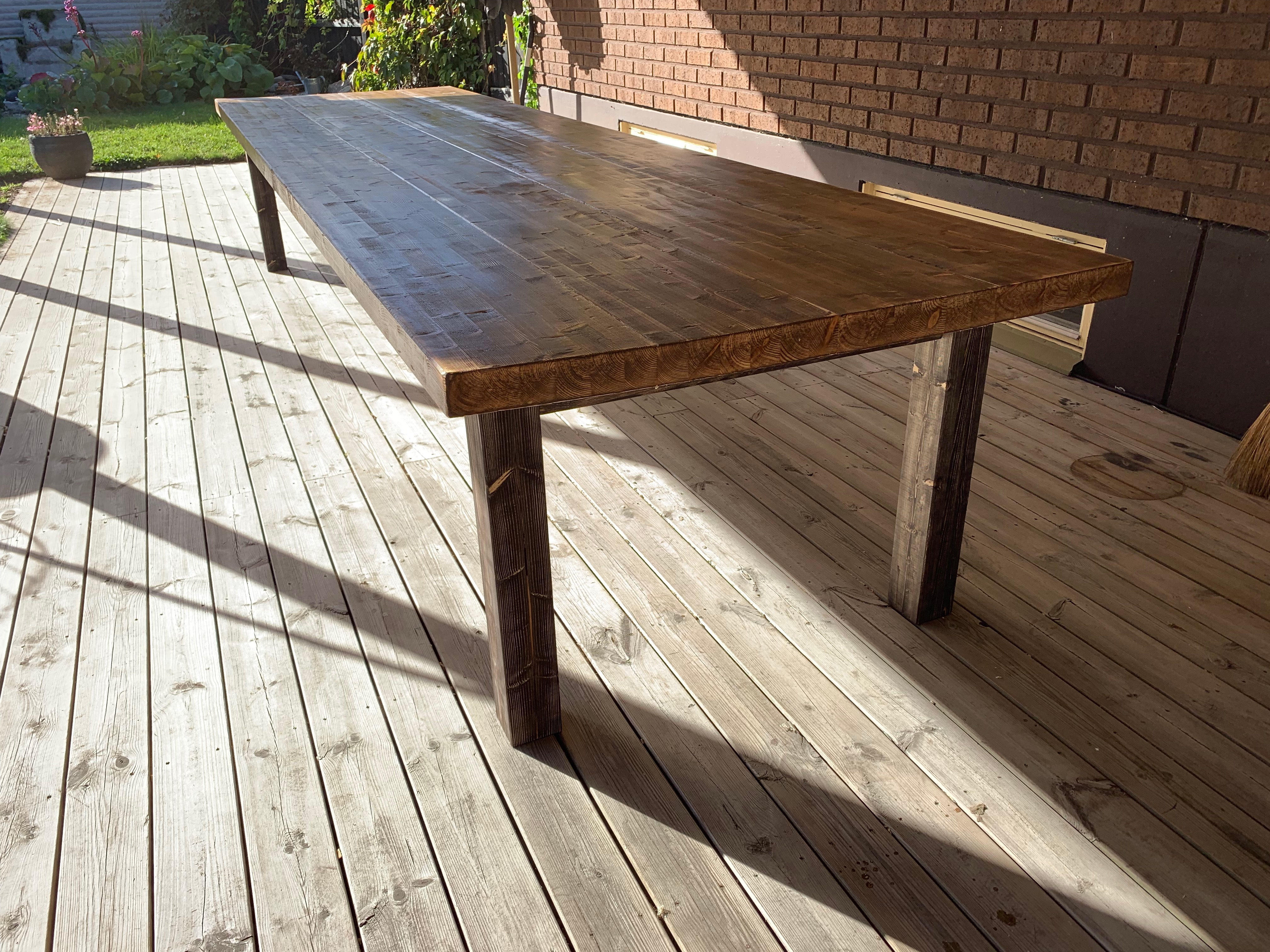 Under det nya altantaket jag byggde i höstas så behövde vi ett nytt bord, så vi köpte tio nya stolar i sådan där konstrotting och så satte jag igång och byggde ett stort bord där många ryms runt. Jag valde att köpa limträbalk och använda dominos för att sätta ihop dem till en stor skiva. Limträbalk är ju rätt så formstabilt vilket var tanken.