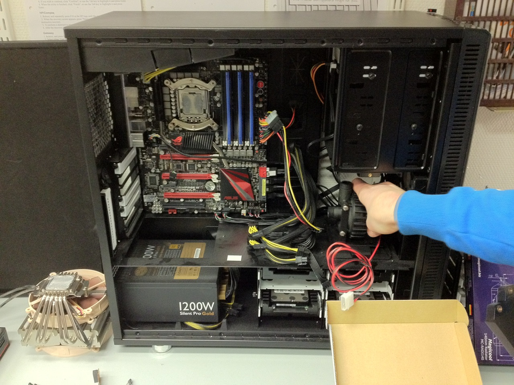 Här är min datorlåda, och förutom att vi här diskuterar vart pumpen ska vara så har vi tagit ut alla komponenter.