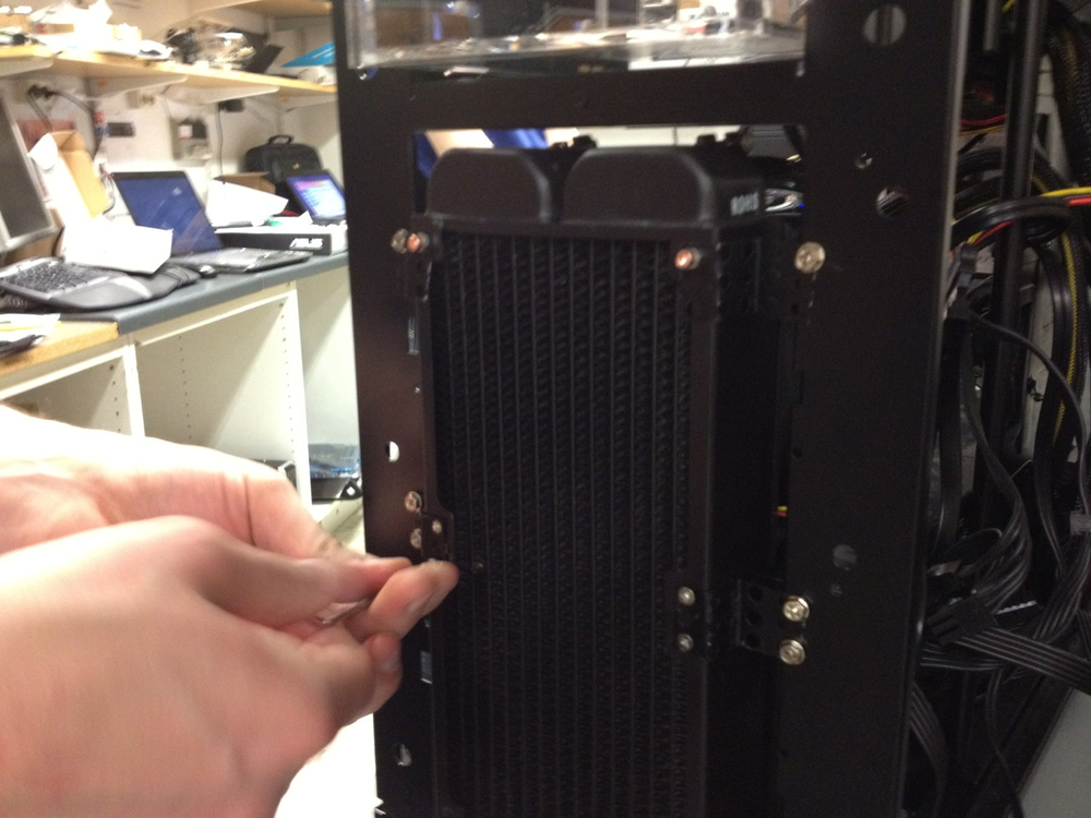 Detta är den främre radiatorn, som kyler vattnet efter det varit till grafikkorten. Denna var klurig att få på plats. Originalfronten har en plasthållare för två fläktar. Den plasthållaren gick inte att återanvända eftersom radiatorn var för tjock, så vi fick böja till lite metallbitar för att skruva fast den.